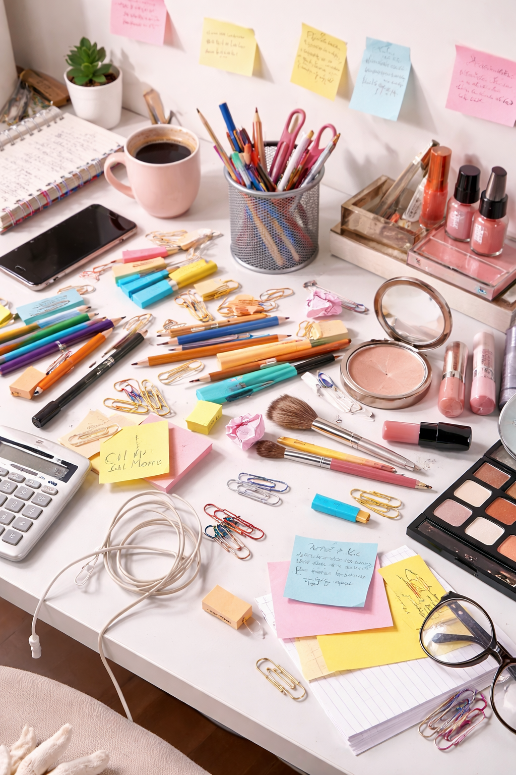 Canetas espalhadas, maquiagem perdida, pequenos objetos sem lugar…